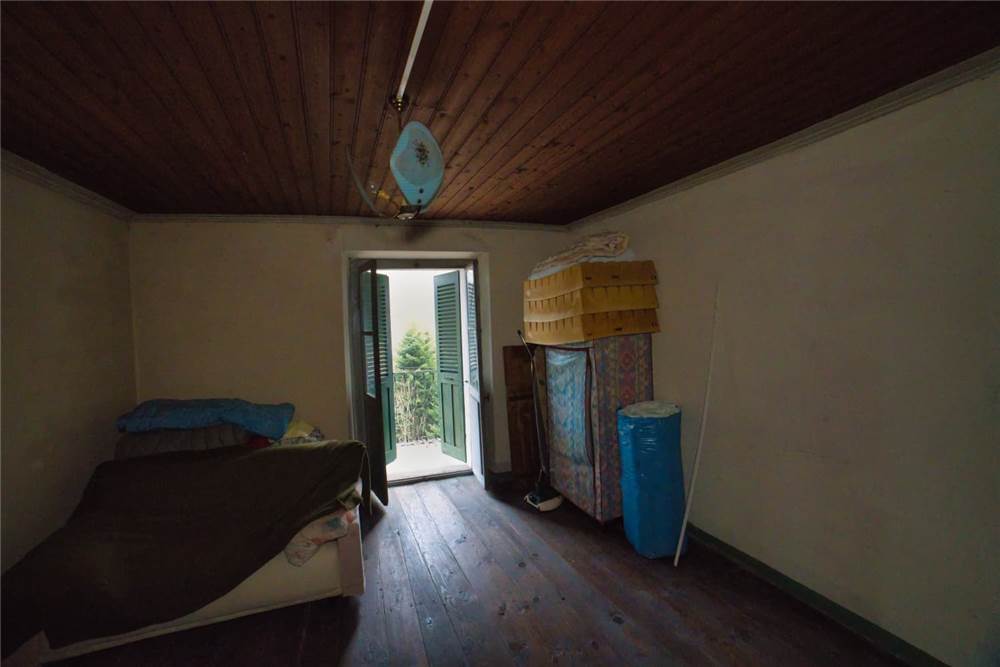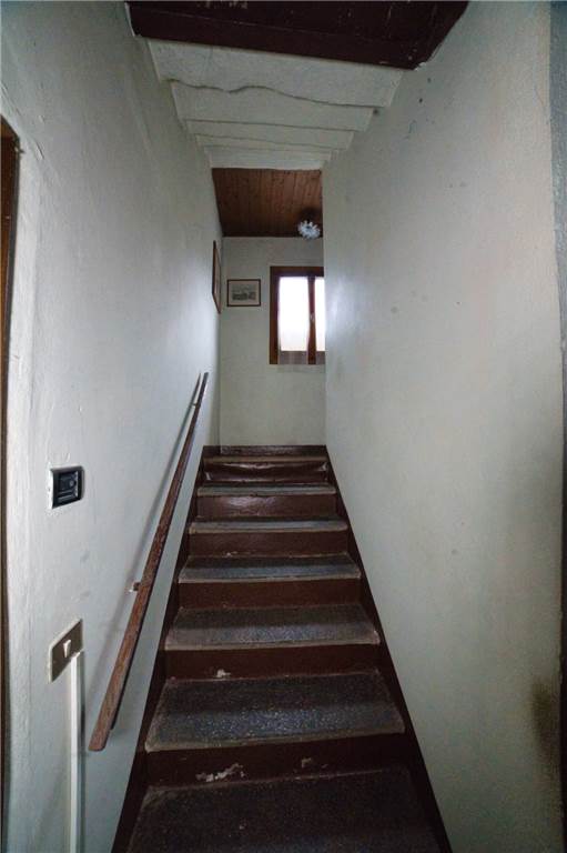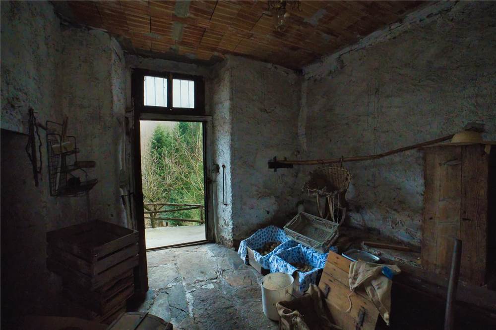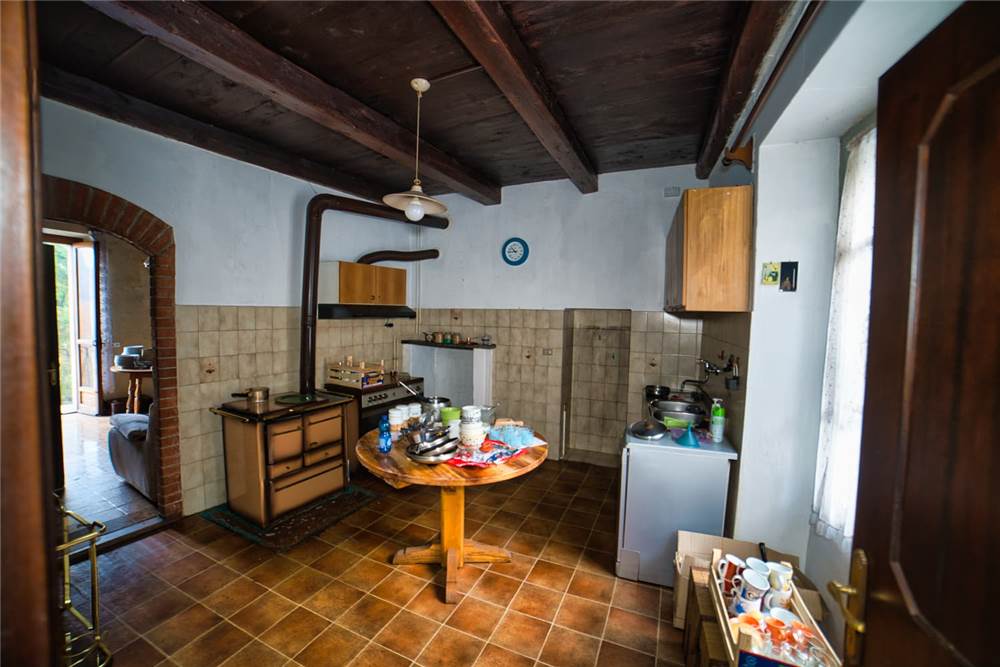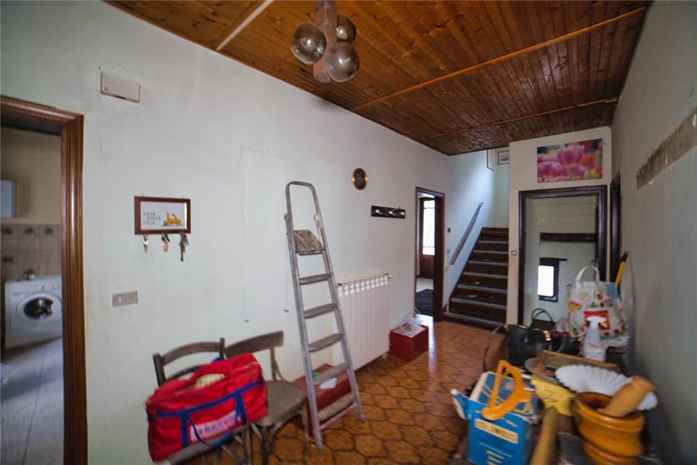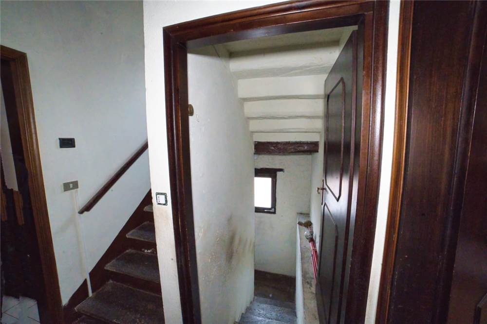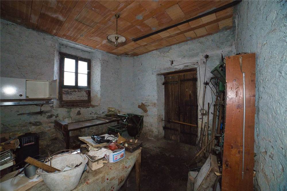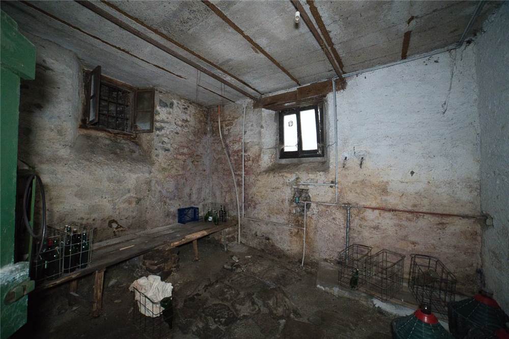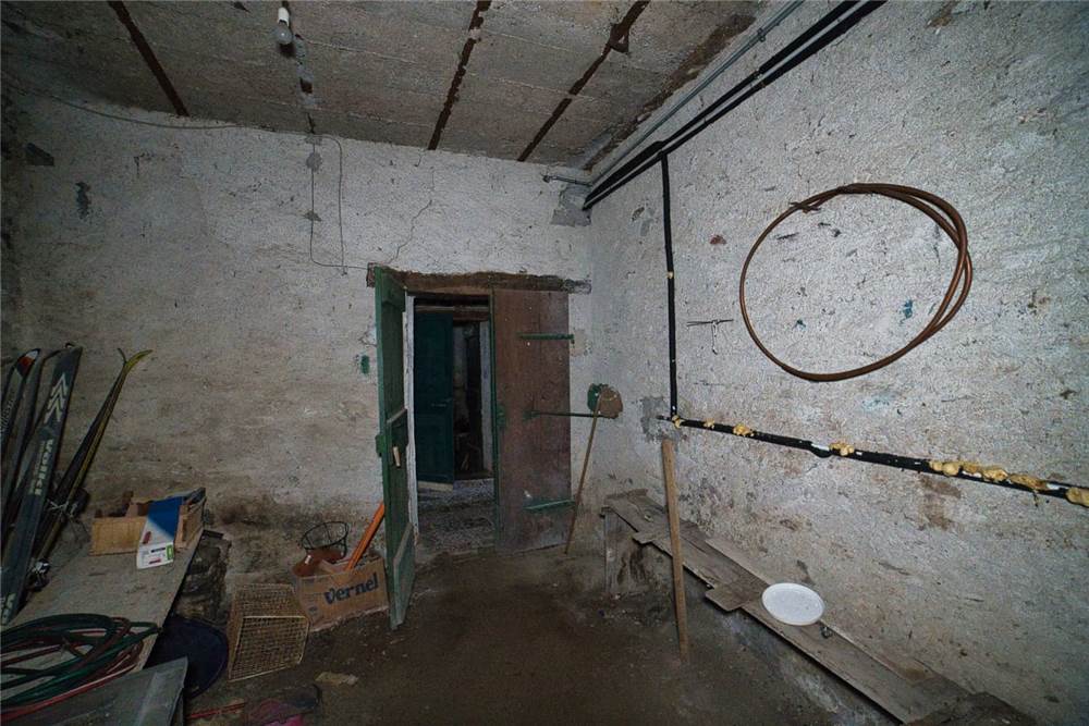 Venedo all'edificio, questo vede l'ingresso principale sulla strada statale, mente un'entrata laterale dal prato, variamente sfruttabile, conduce direttamente in giardino. Una volta dentro troviamo quattro locali del piano terra comprensivi di cucina, bella sala con camino e caratteristico separé a volta in mattoni, altro locale e bagno con vasca. Un lungo balcone panoramico, da cui si può godere di una bella vista panoramica sulla vallata, corre esternamente alle stanze a sud di questo livello. Gli altri piani sono collegato da scalinata interna in sasso antico. Attraverso questa, scendendo, si arriva a quattro locali utilizzabili come cantine, area di lavoro o di deposito. Qui è presente anche un piccolo bagno di servizio, utile per ripulirsi in caso di lavori nel verde, prima di salire in abitazione. Da uno di questi locali si esce poi in giardino.