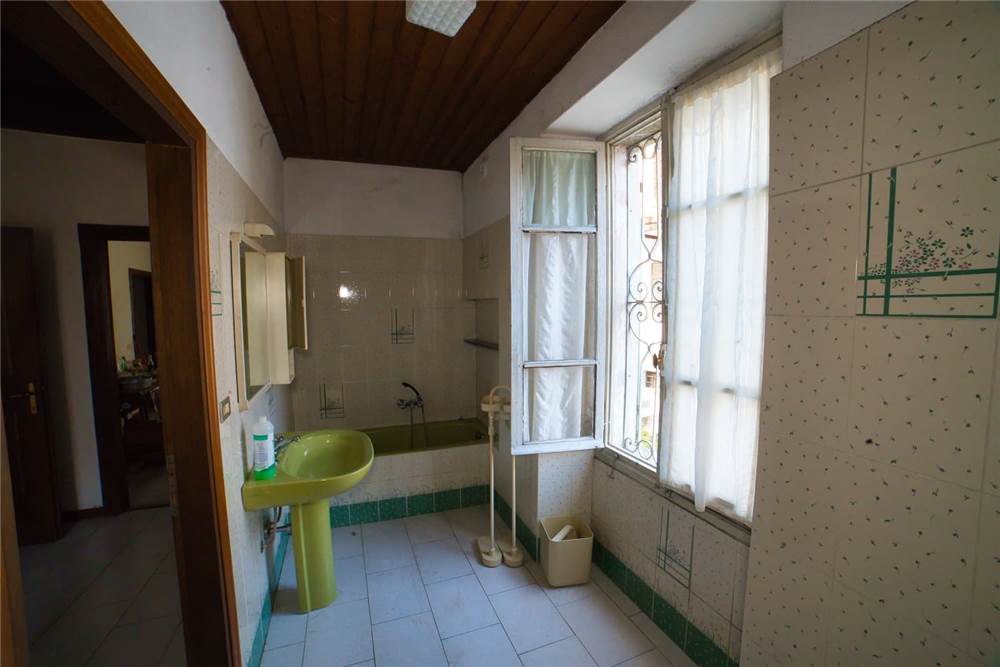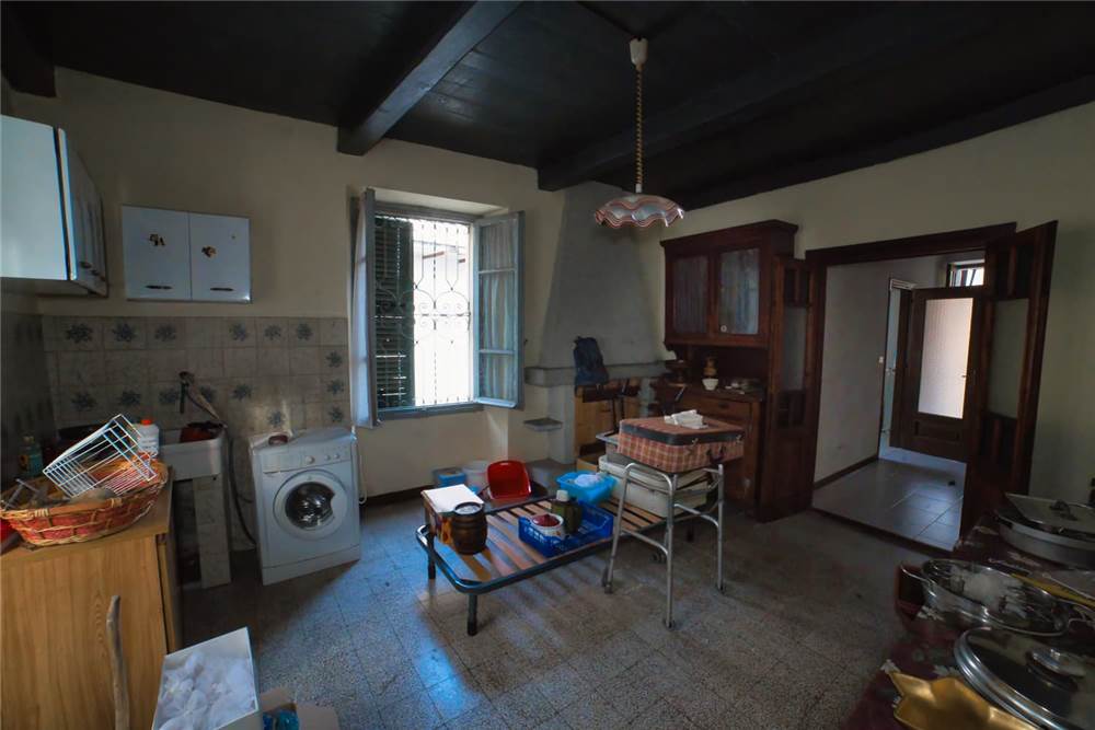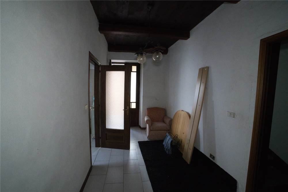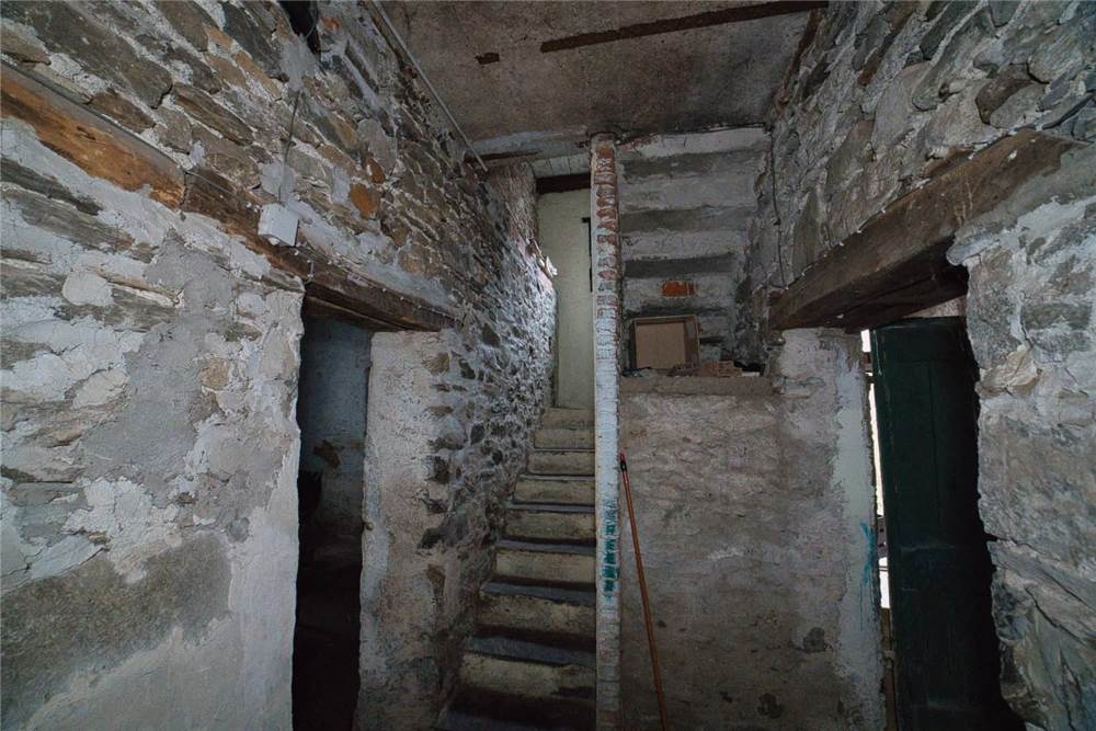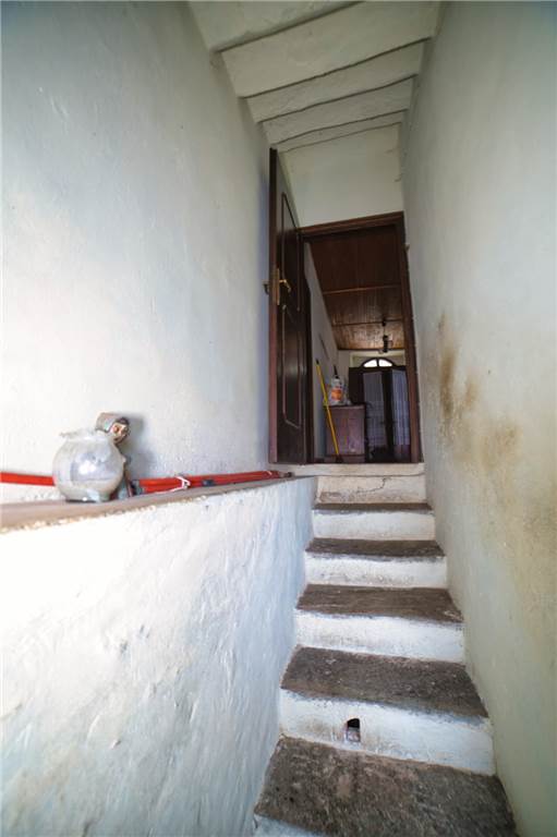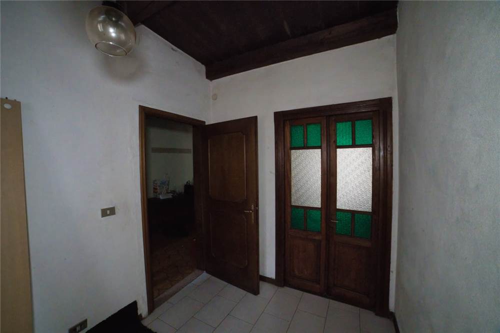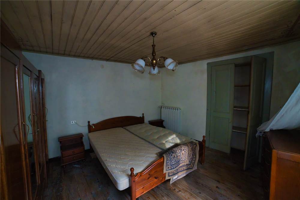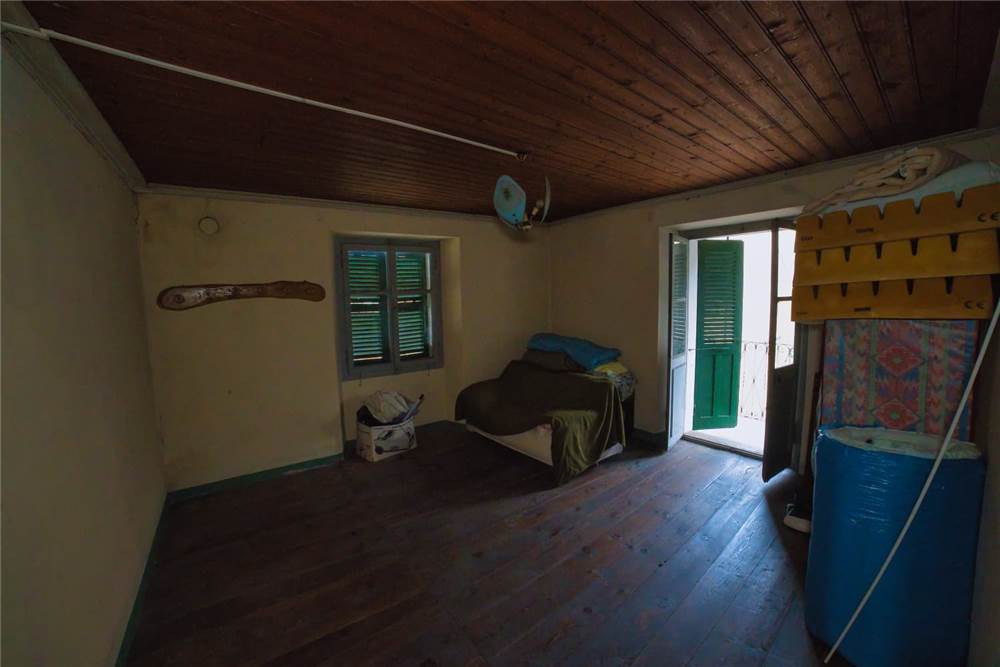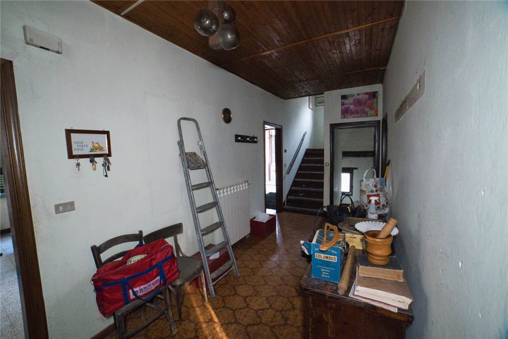 Venedo all'edificio, questo vede l'ingresso principale sulla strada statale, mente un'entrata laterale dal prato, variamente sfruttabile, conduce direttamente in giardino. Una volta dentro troviamo quattro locali del piano terra comprensivi di cucina, bella sala con camino e caratteristico separé a volta in mattoni, altro locale e bagno con vasca. Un lungo balcone panoramico, da cui si può godere di una bella vista panoramica sulla vallata, corre esternamente alle stanze a sud di questo livello. Gli altri piani sono collegato da scalinata interna in sasso antico. Attraverso questa, scendendo, si arriva a quattro locali utilizzabili come cantine, area di lavoro o di deposito. Qui è presente anche un piccolo bagno di servizio, utile per ripulirsi in caso di lavori nel verde, prima di salire in abitazione. Da uno di questi locali si esce poi in giardino.