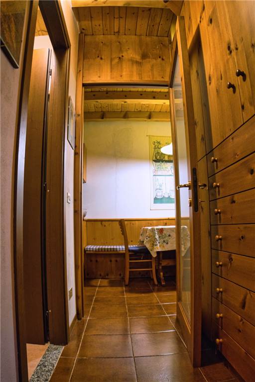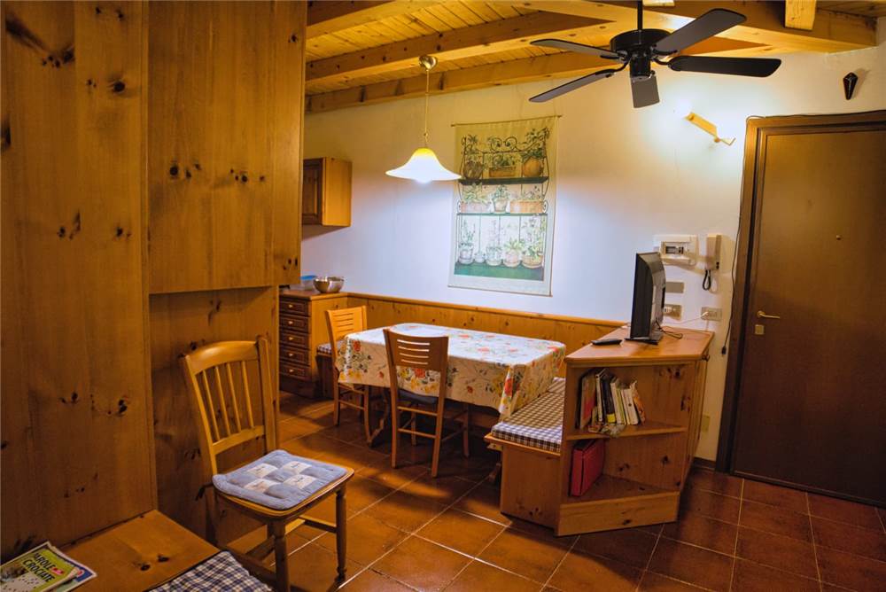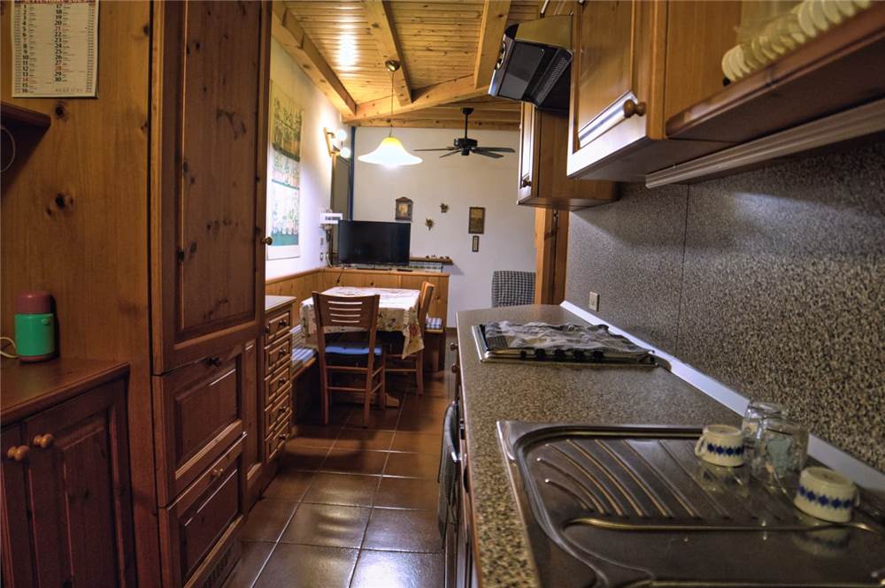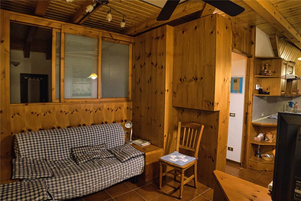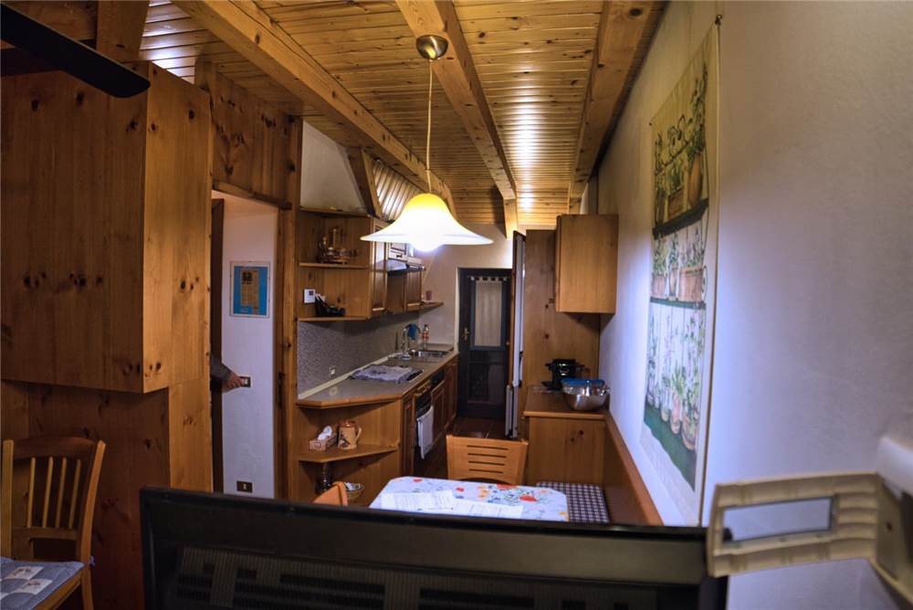 L'appartamento che proponiamo sorge al terzo ed ultimo piano della palazzina, è perlinato in stile montano ed ammobiliato quasi totalmente in legno. La ripartenizione dei locali è la seguente: ingresso, sala, cucina, bagno con doccia e lavatrice e due camere da letto. I pavimenti sono in piastrelle, mentre gli infissi di finestre (e porte-finestre in cucina e in camera) sono in legno con doppi vetri in ogni locale.