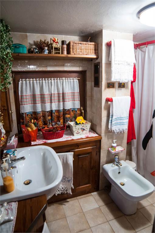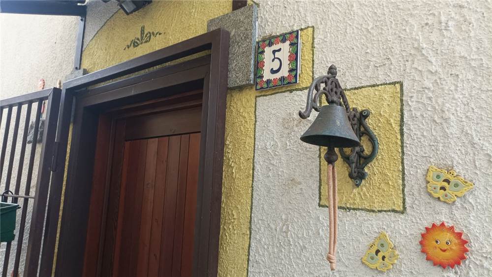 Al piano terra,superato l'ingresso, abbiamo un caloroso salotto con camino e la cucina. Una scala in legno laterale conduce al primo piano ove incontriamo un'ampia camera con letto a castello e altro letto e bagno con doccia e bidet. In questo piano è presente un balcone ben esposto, da cui ci si può affacciare sul giardino e sulla vallata sottostante. Gli infissi basculanti sono in legno con doppio vetro, anche per quanto riguarda il portone all'ingresso, mentre i pavimenti sono in piastrelle.