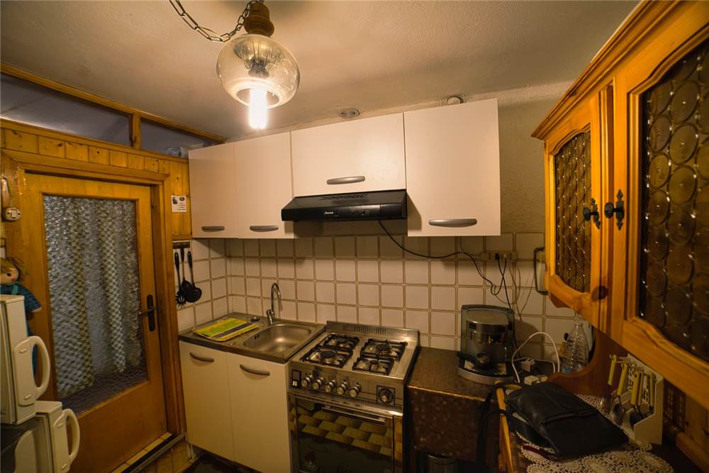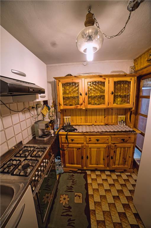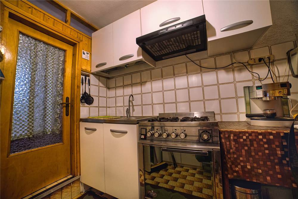 Una porta separé in legno e vetrate conduce al piccolo angolo cottura ben fornito di elettrodomestici e cucina a metano. Abbiamo infine un bagno con vasca e scaldabagno elettrico.