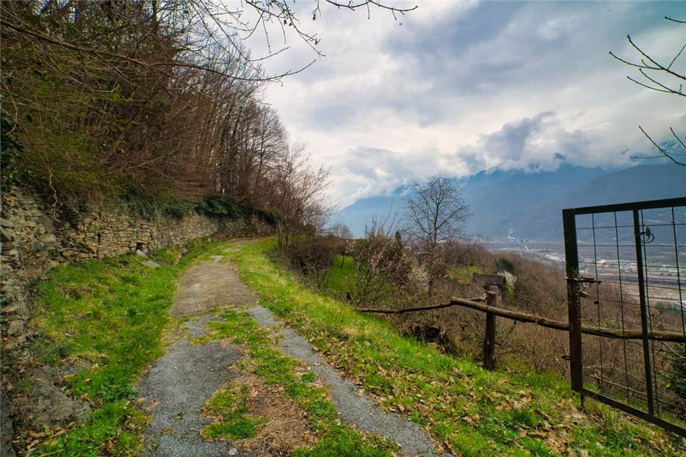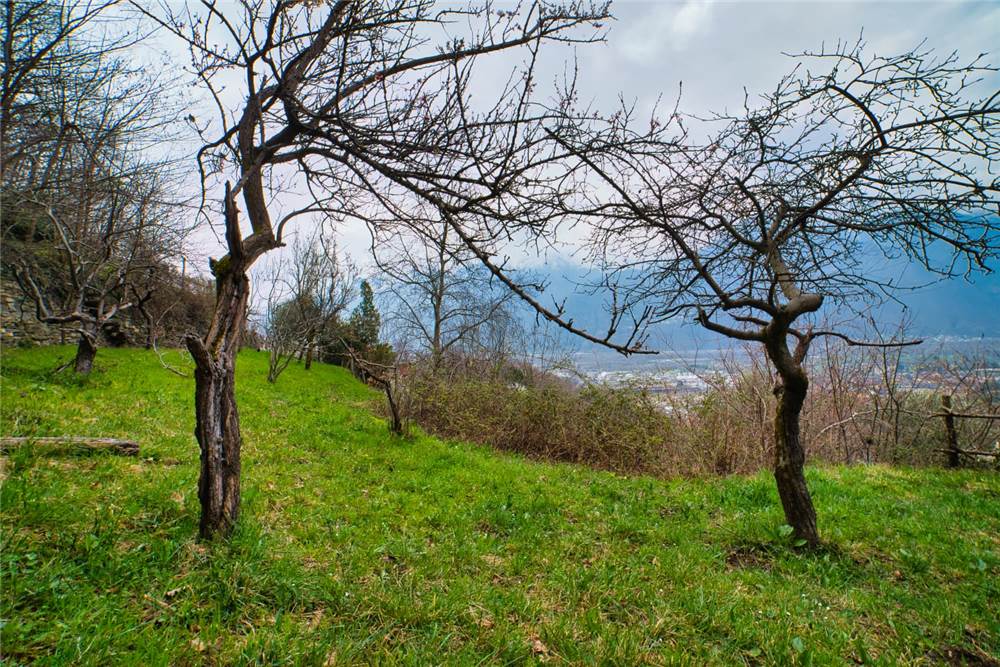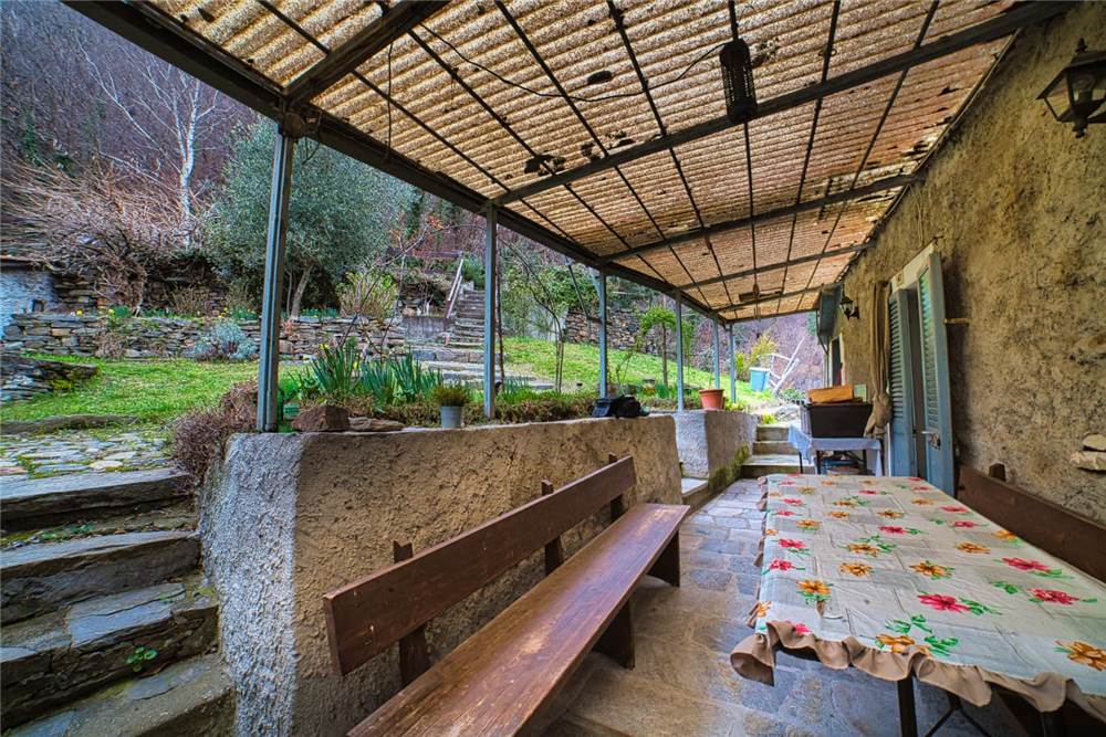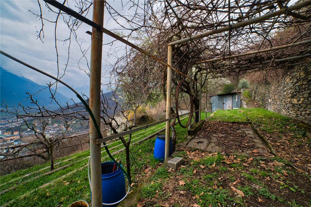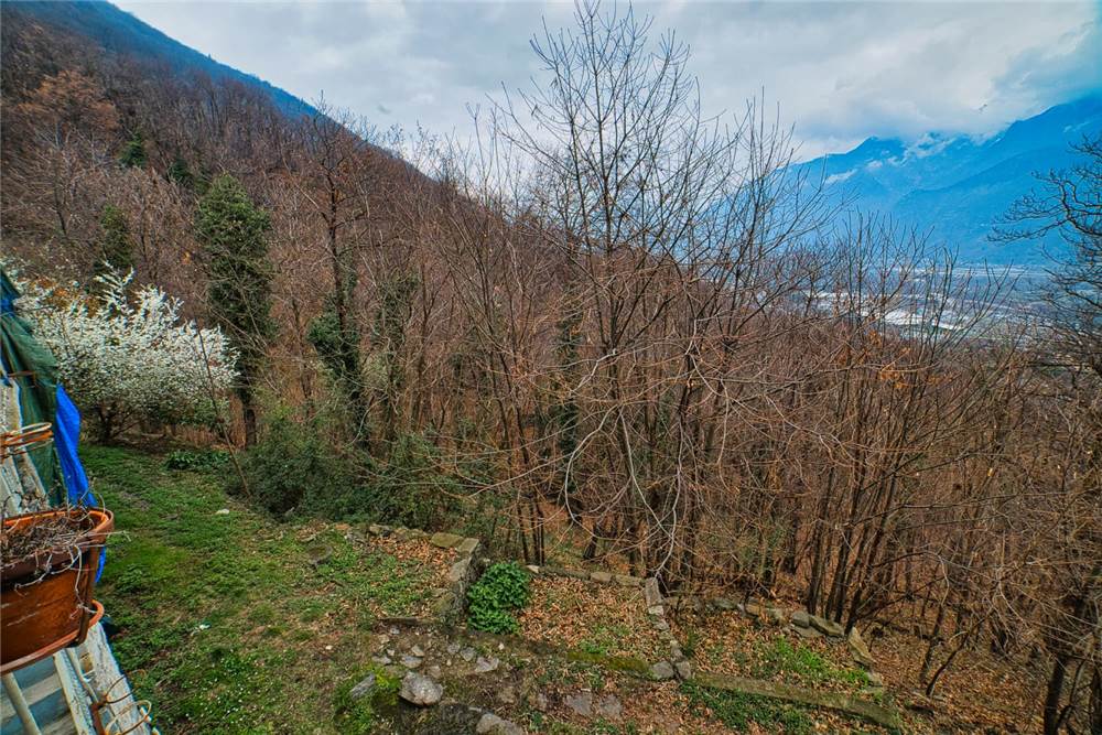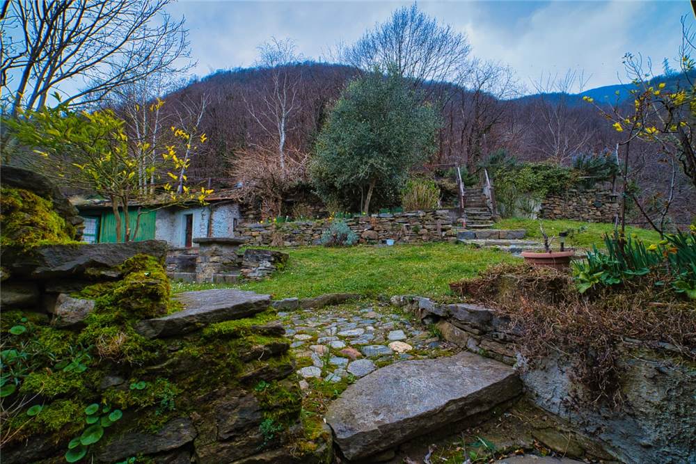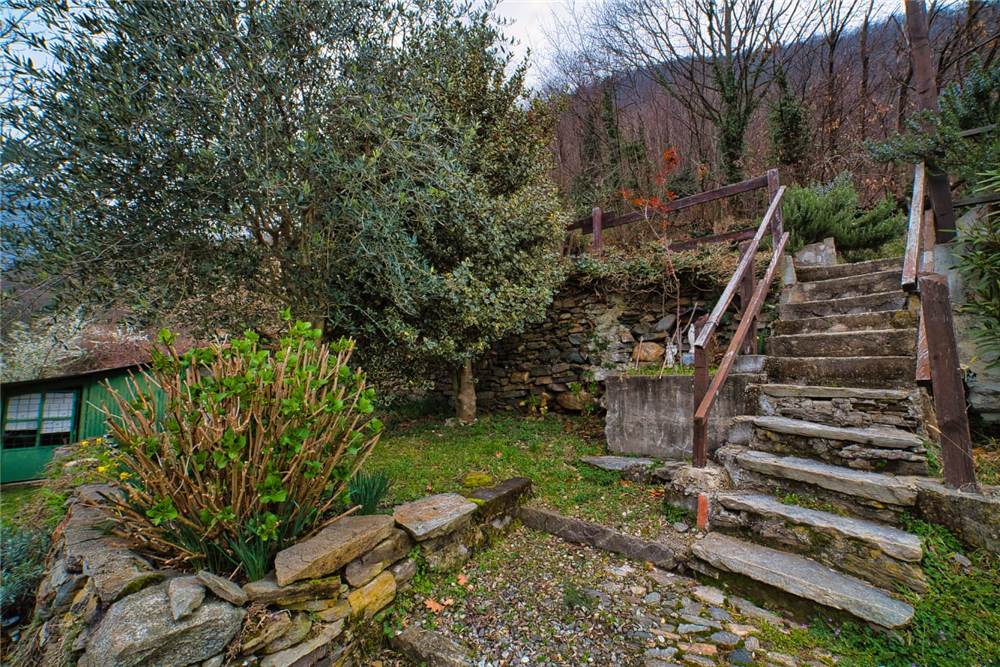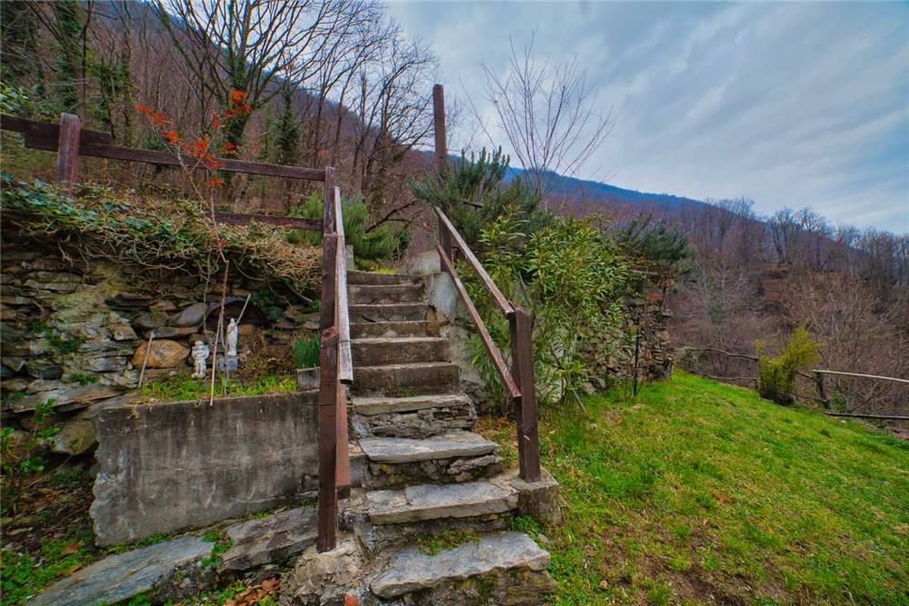 Qui, scendendo alcuni gradini in pietra si giunge al giardino antistante la casa. Questo è privato anche se occorre garantire un semplice diritto di passaggio per altra proprietà del complesso abitativo. Qui ci si trova immersi in un caratteristico angolo di pace, con elementi estetici in sasso,un tavolo circolare e panchina ad arco sempre in sasso, ideale per momenti di relax all'aperto. Tutt'intorno abbiamo l'esteso prato a gradoni recintato e piantumato con alberi di betulle, di noci e piante di kiwi. Come anticipato, tutta questa parte della proprietà è delimitata da muraglioni e staccionate; l'ulteriore estesa area boschiva è libera e si estende esternamente sopra e sotto.